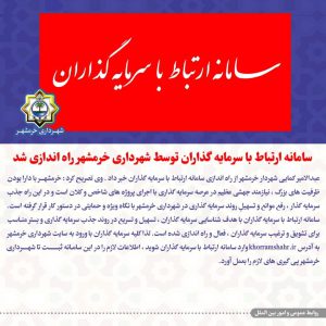سامانه ارتباط با سرمایه گذاران توسط شهرداری خرمشهر راه اندازی و فعال شد خبرنگار: سپیده حاتمی ۱۴۰۰-۱۰-۲۲ ادامه خبر
