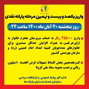 شهردار خرمشهر از اعطای تسهیلات بانکی ۵۰ میلیون تومانی به کارکنان شهرداری خبر داد خبرنگار: سپیده حاتمی ۱۴۰۰-۰۸-۱۸ ادامه خبر