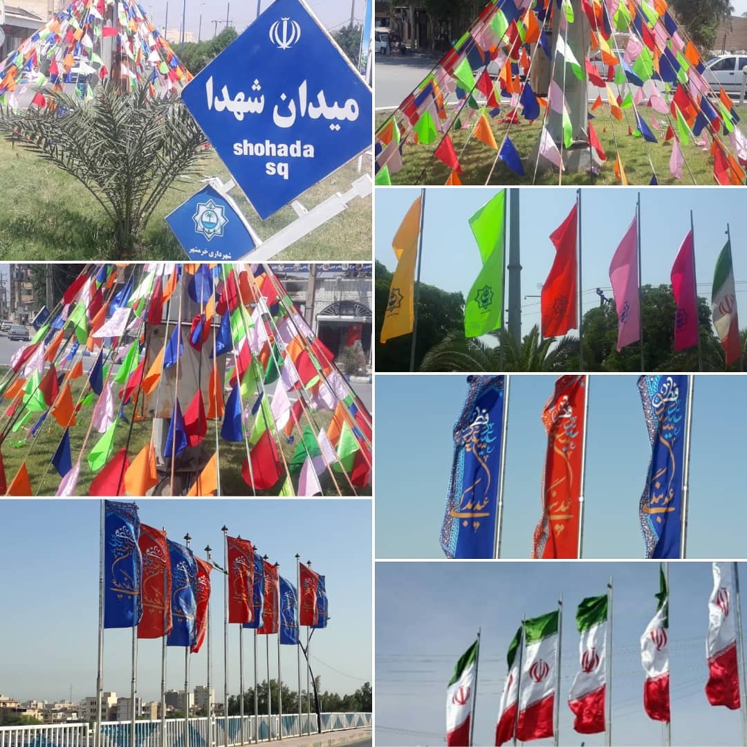 به مناسبت عید سعید فطر شهرداری خرمشهر با نصب پرچم با طرح تبریک عید فطر ، نصب پرچم ایران و پرچم های الوان رنگی ، نصب ریسه های پرچمی در رنگ های متنوع و شاد و نصب بنر با طرح های مختلف نسبت به فضاسازی و آذین بندی نقاط مختلف سطح شهر از جمله پُل ها ، میادین و معابر نمود تا شهر آماده برای عید سعید و فرخنده فطر باشد .
