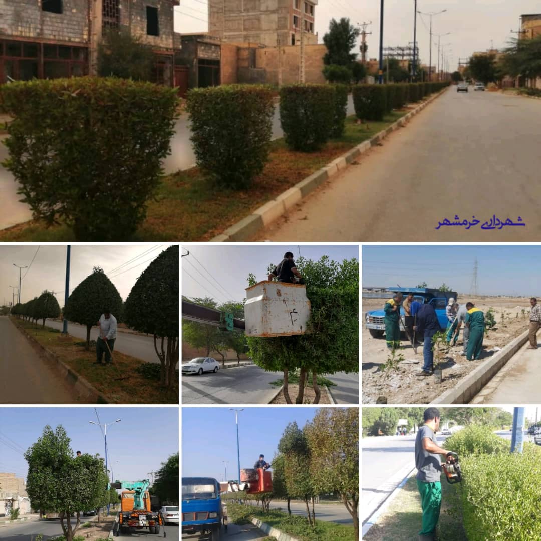 سازمان فضای سبز شهرداری خرمشهر در یک روز کاری اقدام به هرس و فرم دهی درختان سطح شهر در نقاط مختلف با استفاده از طرح ها و شکل های متفاوت نمود . و در ادامه در برخی از مناطق سطح شهر از جمله منازل مسکن مهر جنب پایانه مسافربری هجرت مبادرت به کاشت نهال و ایجاد فضای سبز نمود تا این محدوده که تا پیش از این فاقد فضای سبز بوده از وجود فضای سبز مناسب برخوردار شود ، کاشت گُل متناسب با فصل گرما بخشی دیگر از اقدامات انجام شده بود و سپس با توجه به اهمیت رسیدگی به فضاهای سبز بویژه در فصل گرما که نیازمند بودن رسیدگی را دوچندان می کند بنابراین لازمه ی آن آبیاری مناسب و حفظ و نگهداری می باشد که این مهم نیز در دستور کار سازمان فضای سبز شهرداری خرمشهر قرار گرفت . فضاهای سبز از اهمیت خاصی برخوردار می باشند که علاوه بر بهبود سیما و منظر شهری ، استفاده مردم از اینگونه فضاها جهت گذران اوقات فراغت از قبیل بوستان ها ، برقراری تعاملات اجتماعی ، ورزش و… در روحیه و نشاط شهروندان نیز تاثیرات مثبتی را ایفا خواهند کرد .