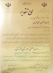 به گزارش خبرنگار روابط عمومی، به‌ مناسبت گرامی داشت روز ملی صنعت و معدن جلسه تقدیر از واحدهای تولیدی نمونه استان در سال ۱۳۹۹ با حضور غلامرضا شریعتی استاندار، امیرحسین نظری رییس سازمان صنعت، معدن و تجارت خوزستان و جمعی از مسئولان استانی، ۲۳ شهریور ماه ۱۳۹۹ در سالن کنفرانس استانداری خوزستان برگزار شد.