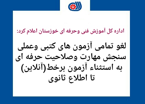 اداره کل آموزش فنی و حرفه ایاهوازبازتاب خوزستانخوزستانلغو تمامی آزمون های کتبی وعملی مهارت تا اطلاع ثانوی