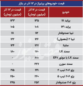 به گزارش بازتاب خوزستان به نقل از اقتصادنیوز؛ براساس ارزیابی های صورت گرفته بازار خودرو دیروز شاهد رشد قیمت نسبت به میانه هفته بود، اما این روند دیروز تعدیل شد بطوریکه بسیاری از خودروهای پرتیراژ مجدد وارد کانال افت قیمت شدند. قیمت پراید ۱۳۱ که در روزهای آخر هفته گذشته به زیر ۱۰۰ میلیون تومان رسید و با رنج قیمتی ۹۵ تا ۹۷ میلیون تومان خرید و فروش شد، مجدد به کانال ۱۰۰ میلیون تومان وارد شد و در بازار ۱۰۸ میلیون تومان قیمت خورد، اما این خودرو مجدد افت قیمت را تجربه کرد قیمت این خودرو ۱۰۵ میلیون تومان عنوان می شود این قیمت گرچه در مقایسه با روز سه شنبه سه میلیون تومان ارزان تر است اما قیمت پراید را در کانال ۱۰۰ میلیون نگه داشت.در میان محصولات ایران خودرو نیز دو خودرو پرطرفدار این شرکت یعنی ۲۰۶ تیپ ۲ و تیپ ۵ که رشد قیمت داشته اند؛ روند نزولی را تجربه کردند، به طوریکه پژو ۲۰۶ تیپ ۲ با ۴ میلیون تومان کاهش، ۱۹۵ میلیون تومان و تیپ ۵ نیز با ۱۰ میلیون تومان افت قیمت، ۲۵۰ میلیون تومان در بازار معامله شد؛ سایر محصولات این دو خانواده نیز در بازار افت قیمت را تجربه کردند. اما در خصوص دو خودرو «lx سمندبا موتور EF7 » و «سمندسورن» به دلیل عدم عرضه امکان کشف قیمت آنها در بازار وجود نداشت.
