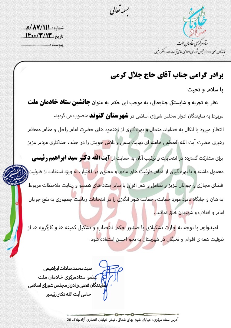 نظر به تجربه و شایستگی جنابعالی به موجب این حکم به عنوان جانشین ستاد خادمان ملت؛ مربوط به نمایندگان ادوار مجلس شورای اسلامی، در شهرستان گتوند، منصوب می گردید؛ انتظار می‌رود با اتکال به خداوند متعال و بهره گیری از رهنمودهای حضرت امام راحل و مقام معظم رهبری حضرت آیت الله العظمی خامنه‌ای،نهایت سعی و تلاش خویش را در جذب حداکثری مردم عزیز برای مشارکت گسترده در انتخابات و ترغیب آنان به حمایت از آیت الله دکتر سید ابراهیم رئیسی، معمول داشته و با بهره‌گیری از تمام ظرفیت‌های مادی و معنوی در اختیار؛ به ویژه استفاده از ظرفیت فضای مجازی و جوانان عزیز و تعامل و هم افزایی با سایر ستادهای همسو و رعایت ملاحظات مربوط به شان و جایگاه؛ نامزد مورد حمایت، حماسه شورانگیز را در انتخابات ریاست جمهوری، به نفع جریان امام و انقلاب و شهیدان خلق نمایید؛ امیدوارم با توجه به چارت تشکیلاتی، با صدور حکم انتصاب و تشکیل کمیته ها و کار گروه ها، از ظرفیت همه ی اقوام و نخبگان، به نحو احسن استفاده شود.