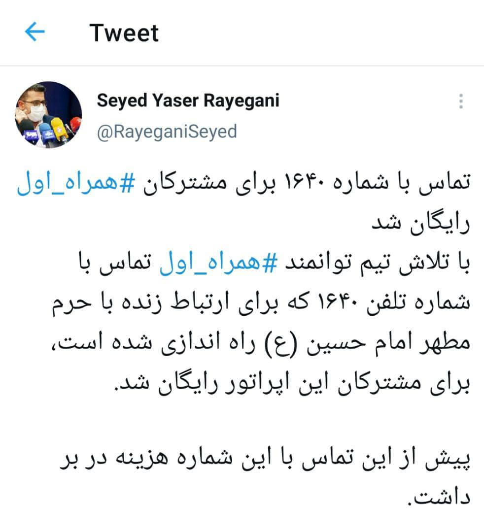 به گزارش بازتاب خوزستان،مدیرکل ارتباطات و سخنگوی همراه اول با اشاره به رایگان شدن تماس با شماره ۱۶۴۰ گفت: این شماره برای ارتباط زنده با حرم مطهر امام حسین(ع) راهاندازی شده است.