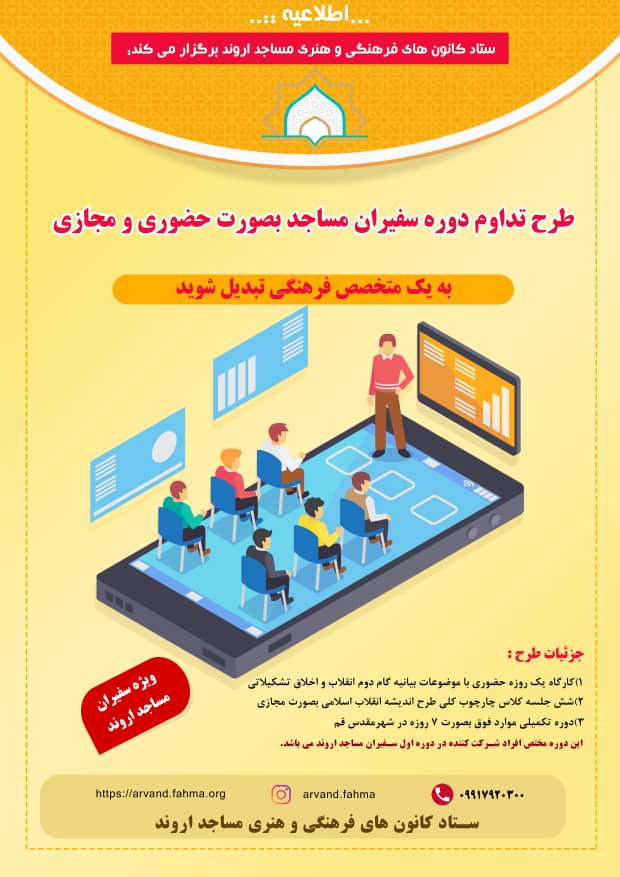 به گزارش بازتاب خوزستان از روابط عمومی اداره کل فرهنگ و ارشاد اسلامی منطقه آزاد اروند ،حسین قانعیان صبح امروز (چهار شنبه ۶ بهمن ماه سال ۱۴۰۰) اظهار کرد: این دوره به منظور ارتقای سطح کمی و کیفی کانون‌های فرهنگی هنری مساجد اروند شامل: شهرهای آبادان، خرمشهر، مینوشهر، چوئبده ، منیوحی و اروندکنار برگزار می‌شود. مدیر ستاد هماهنگی کانون‌های فرهنگی هنری مساجد اروند افزود: این دوره به دو شیوه حضوری و مجازی برگزار می گردد و به موضوعاتی چون ؛ بیانیه گام دوم انقلاب ،کلیات اندیشه انقلاب اسلامی و اخلاق تشکیلاتی می پردازد. قانعیان بیان کرد: در دومین دوره طرح ” سفیران مساجد اروند ” کارگاه آموزشی اخلاق تشکیلاتی و بیانیه گام دوم انقلاب بصورت حضوری طی دوروز برگزار و کارگاه کلیات طرح اندیشه انقلاب اسلامی طی ۶ جلسه بصورت مجازی اجرا می شود . وی با بیان اینکه در این دوره از اساتید برجسته کشوری دعوت شده است افزود: سعی داریم با تداوم دوره طرح ” سفیران مساجد اروند ” در راستای ارتقای کانون‌های فرهنگی هنری مساجد این منطقه گامی موثر انجام دهیم. قانعیان گفت: دومین دوره طرح ” سفیران مساجد اروند “در آبادان از فردا (پنج شنبه ۷ بهمن ماه) تا (جمعه ۸ آذر ماه) به مدت دو روز ویژه برادران عضو کانون‌های فرهنگی هنری منطقه آزاد اروند برگزار می گردد.