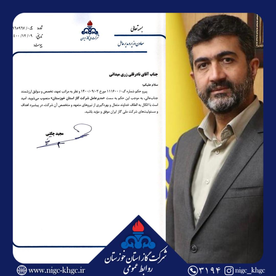 به گزارش بازتاب خوزستان از روابط عمومی شرکت گاز استان خوزستان، در حکمی از سوی مجید چگنی معاون وزیر نفت و مدیر عامل شرکت ملی گاز ایران، نادرقلی زری میدانی به عنوان مدیر عامل شرکت گاز استان خوزستان منصوب شد.