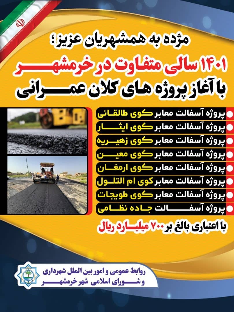 به گزارش بازتاب خوزستان ازروابط عمومی و امور بین الملل شهرداری خرمشهر :شهرداری خرمشهر سال ۱۴۰۱ را با اجرای پروژه های کلان عمرانی در حوزه بهسازی معابر در بیش از ۸ محله با اعتباری بالغ بر ۷۰۰ میلیارد ریال آغاز کرده است. پروژه آسفالت معابر کوی طالقانی ، پروژه آسفالت معابر کوی ایثار ، پروژه آسفالت معابر کوی زهیریه ، پروژه آسفالت معابر کوی معین ، پروژه آسفالت معابر کوی ارمغان ، کوی ام التلول ، کوی طویجات و جاده نظامی بخشی از پروژه های عمرانی می باشد که در پیش از ۸ محله توسط شهرداری خرمشهر عملیاتی شده است.