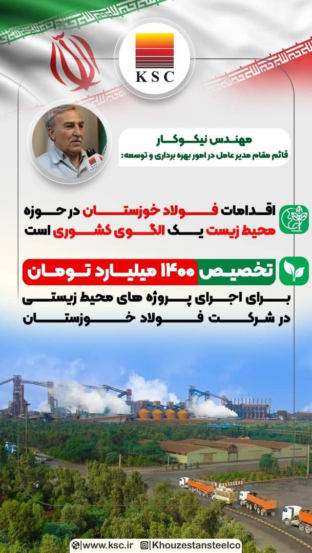 🔸قائم مقام مدیر عامل فولاد شرکت خوزستان در امور بهره برداری و توسعه با اشاره به نگاه و توجه مدیرعامل فولاد خوزستان به پروژه های محیط زیستی عنوان کرد: جلسات پروژههای زیست محیطی در بالاترین سطح در شرکت تشکیل و پیگیری می شود و در کمیته راهبری توسط مدیر عامل رصد می شود و این همراهی و همدلی باعث شده است تاکنون۱۴۰۰ میلیارد تومان برای اجرای پروژه های محیط زیستی در شرکت فولاد خوزستان تخصیص یابد.