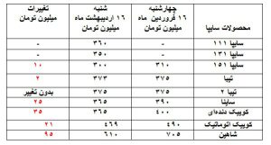 در محصولات گروه خودروسازی سایپا نیز کاهش ۲۵ و ۳۵ میلیون تومانی دیده میشود اما قیمت تیبا دو میلیون تومان و قیمت شاهین ۹۵ میلیون تومان کاهش داشتهاند و حداقل و حداکثر کاهش را به خود اختصاص دادهاند.