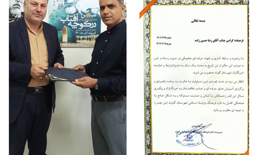 بنا بر تجربه و سابقه کاری و تعهد حرفه ای جنابعالی در حوزه رسانه و خبر به موجب این حکم از این تاریخ به مدت یک سال به عنوان رابط و نماینده خبرنگاران شهرستان گتوند منصوب می شوید.