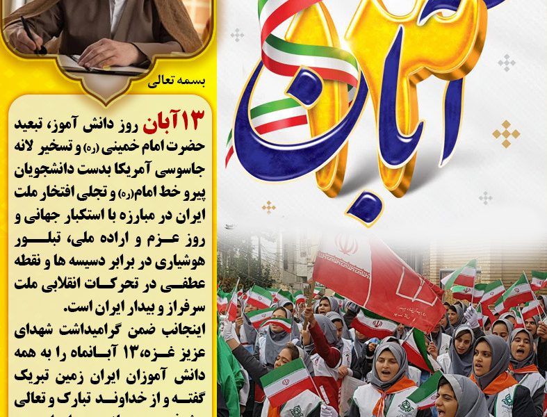 ۱۳ آبان روز دانش آموز، تبعید حضرت امام خمینی( ره) و تسخیر لانه جاسوسی آمریکا بدست دانشجویان پیرو خط امام( ره) و تجلی افتخار ملت ایران در مبارزه با استکبار جهانی و روز عزم و اراده ملی، تبلور هوشیاری در برابر دسیسه های و نقطه عطفی در تحرکات انقلابی ملت سرافراز و بیدار ایران است.