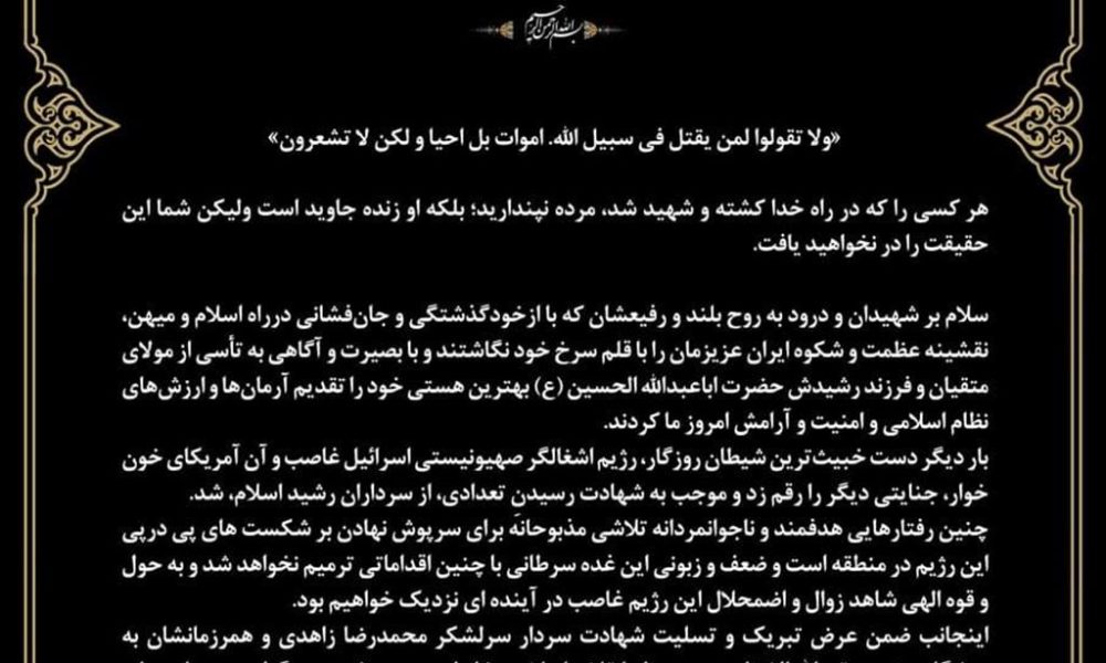 اینجانب ضمن عرض تبریک و تسلیت شهادت سردار محمدرضا زاهدی و همرزمانشان به پیشگاه حضرت بقیهالله الاعظم، رهبر معظم انقلاب اسلامی، خانواده محترم شهید بزرگوار و دوستان، برای آنان صبر جمیل و اجر جزیل و برای روح متعالی ایشان رحمت و علو درجات را از درگاه خداوند رحمان مسئلت داشته و این اقدام جنایتکارانه رژیم جعلی صهیونیستی به سرکردگی آمریکا را به شدت محکوم میکنم.