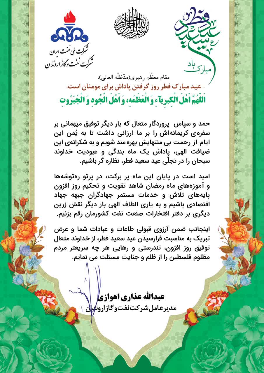 پیام مدیرعامل شرکت نفت و گاز اروندان به مناسبت فرا رسیدن عید سعید فطر