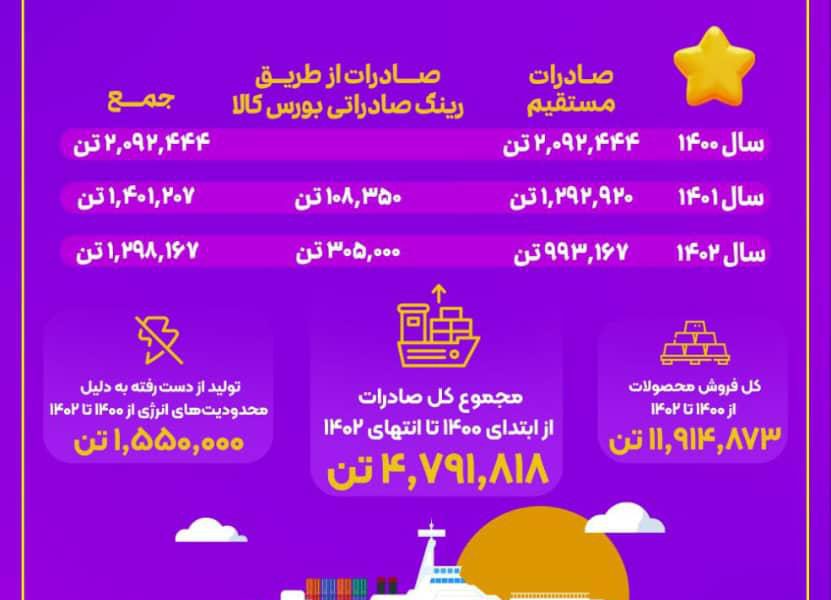 این شرکت همچنین در سال ۱۴۰۱ به‌عنوان بزرگ‌ترین صادرکننده زنجیره فولاد کشور، موفق به صادرات بیش از ۱.۴ میلیون تن از محصولات خود شد که حدود ۱.۳ میلیون تن از این صادرات به صورت مستقیم و بیش از ۱۰۸ هزار تن آن از طریق رینگ صادراتی بورس کالا بود.