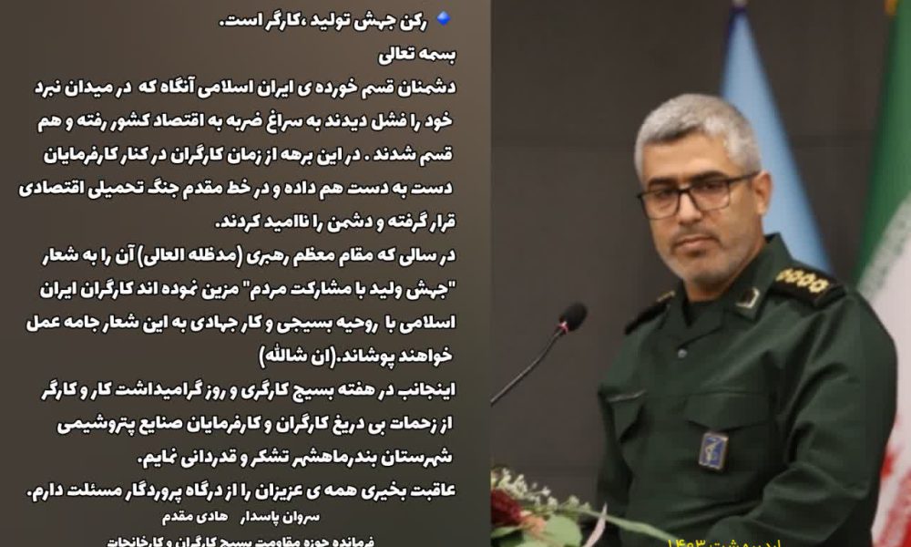 بیانیه فرمانده حوزه مقاومت بسیج کارگران و کارخانجات صنایع پتروشیمی شهرستان بندرماهشهر به مناسب روز کار و کارگر و گرامیداشت هفته بسیج کارگری