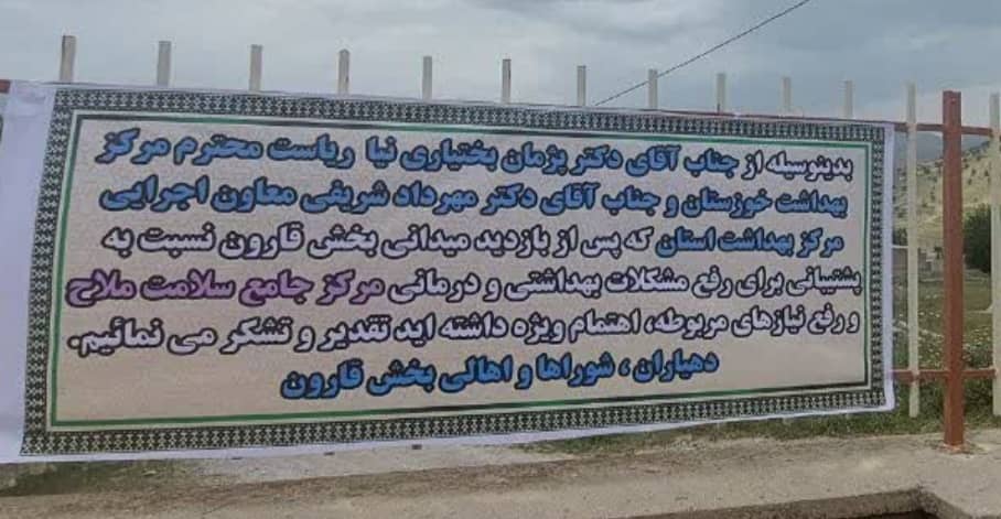 بدینوسیله از جناب آقای دکتر پژمان بختیاری نیا ریاست محترم مرکز بهداشت خوزستان و جناب آقای دکتر مهرداد شریفی معاون اجرایی مرکز بهداشت استان، که پس از بازدید میدانی بخش قارون، نسبت به پشتیبانی برای رفع مشکلات بهداشتی و درمانی مرکز جامع سلامت ملاح و رفع نیازهای مربوطه، اهتمام ویژه داشته اید تقدیر و تشکر می نمائیم.