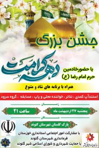 به گزارش بازتاب خوزستان،جشن بزرگ دهه کرامت با حضور خادمین حرم امام رضا (ع) همراه با برنامه های شاد و متنوع (استند آپ کمدی ، تئاتر ، خواننده محلی و پاپ و …) با مشارکت امور اجتماعی استانداری خوزستان ، فرمانداری شهرستان گتوند و حمایت شهرداری و شورای اسلامی شهر گتوند برگزار میگردد.