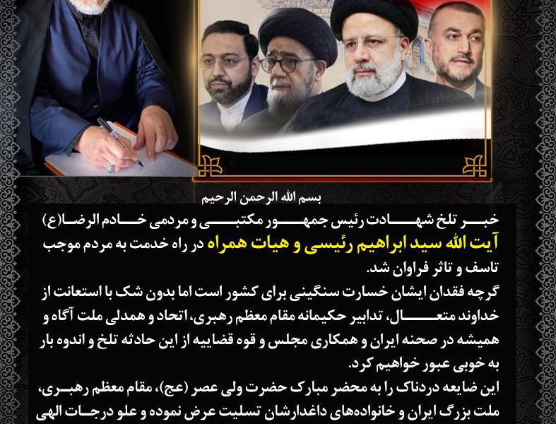 خبر تلخ شهادت رئیس جمهور مکتبی و مردمی خادم الرضا آیت الله سید ابراهیم رئیسی و هیات همراه در راه خدمت به مردم موجب تاسف و تاثر فراوان شد.