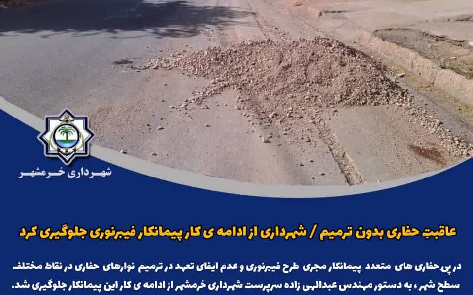در پِی حفاری های متعدد پیمانکار مجری طرح فیبرنوری و عدم ایفای تعهد در ترمیم نوارهای حفاری در نقاط مختلف سطح شهر ، به دستور دامون عبدالهی زاده سرپرست شهرداری خرمشهر از ادامه ی کار این پیمانکار جلوگیری شد . سرپرست شهرداری خرمشهر تصریح کرد : تذکرات لازم داده شد و در حال حاضر هیچگونه اجازه ی حفاری داده نمیشود مگر اینکه پیمانکار مربوطه نسبت به ترمیم نوارهای حفاری سطح شهر اقدام کند تا در تردد شهروندان تسهیل شود./