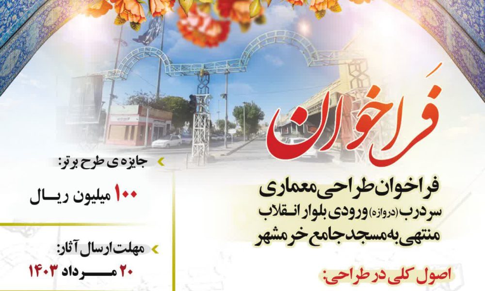 فراخوان طراحی معماری سردرب ( دروازه ) ورودی بلوار انقلاب منتهی به مسجد جامع خرمشهر توسط شهرداری منتشر شد. جایزه طرح برتر ۱۰۰ میلیون ریال می باشد و آخرین مهلت ارسال آثار نیز در این مسابقه ۲۰ مرداد ۱۴۰۳ می باشد. علاقمندان به شرکت در این مسابقه می توانند آثار خود را از طریق ایمیل به