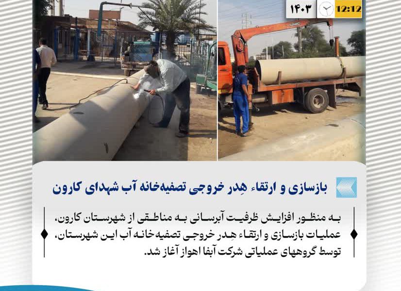 🔹 به منظور افزایش ظرفیت آبرسانی به مناطقی از شهرستان کارون، عملیات بازسازی و ارتقاء هِدر خروجی تصفیه‌خانه آب این شهرستان، توسط گروههای عملیاتی شرکت آبفا اهواز آغاز شد.