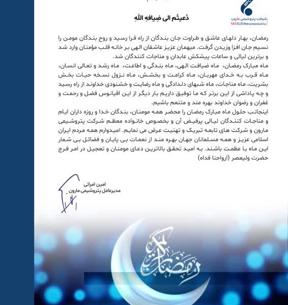 اینجانب حلول ماه مبارک رمضان را محضر همه مومنان، بندگان خدا و روزه داران ایام و مناجات کنندگان لیالی پرفیض آن و بخصوص خانواده معظم شرکت پتروشیمی مارون و شرکت های تابعه تبریک و تهنیت عرض می نمایم. امیدوارم همه مردم ایران اسلامی عزیز و همه مسلمانان جهان بهره مند از نعمات بی پایان و فضائل بی شمار این ماه با عظمت باشند. به امید تحقق بالاترین دعای مومنان و تعجیل در امر فرج حضرت ولیعصر (ارواحنا فداه)