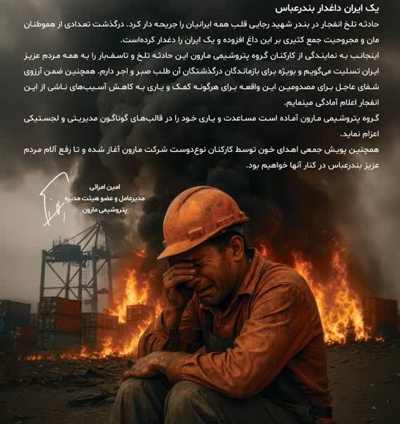 اینجانب به نمایندگی از کارکنان گروه پتروشیمی مارون این حادثه تلخ و تاسف‌بار را به همه مردم عزیز ایران تسلیت می‌گویم و بویژه برای بازماندگان درگذشتگان آن طلب صبر و اجر دارم. همچنین ضمن آرزوی شفای عاجل برای مصدومین این واقعه برای هرگونه کمک و یاری به کاهش آسیب‌های ناشی از این انفجار اعلام آمادگی مینمایم.