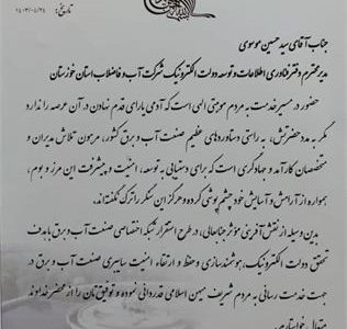 علی اکبر محرابیان وزیر سابق نیرو ، با ارسال لوح سپاسی در زمان تصدی خود از سیدحسین موسوی ، مدیر دفتر فناوری اطلاعات و توسعه دولت الکترونیک شرکت آب و فاضلاب استان خوزستان و کارکنان این دفتر، بواسطه ایفای نقش موثر در استقرار شبکه اختصاصی صنعت آب و برق با هدف تحقق دولت الکترونیک ، هوشمند سازی و حفظ و ارتقاء امنیت سایبری ، قدردانی نمود.