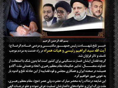 به گزارش بازتاب خوزستان؛متن پیام تسلیت رهبر انقلاب اسلامی: با اندوه و تاسف فراوان خبر تلخِ درگذشتِ شهادت گونهی عالم مجاهد، رئیس جمهور مردمی و با کفایت و پرتلاش، خادمالرضا علیه السلام جناب حجه الاسلام و المسلمین آقای حاج سید ابراهیم رئیسی و همراهان گرامی ایشان رضوان الله علیهم را دریافت کردم. این حادثهی ناگوار […]