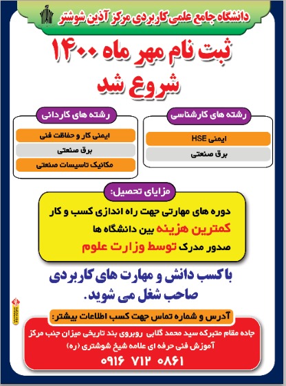 به گزارش بازتاب خوزستان؛ ثبت نام دانشجویان جدیدالورود دانشگاه جامع علمی کاربردی مرکز آذین شوشتر از تاریخ ۲۴ مرداد آغاز شده است؛ و تا ۷ شهریور ادامه خواهد شد. شایان ذکر است؛ متقاضیان گرامی میتوانند به صورت مجازی و یا حضوری نسبت به ثبت نام اقدام نمایند.