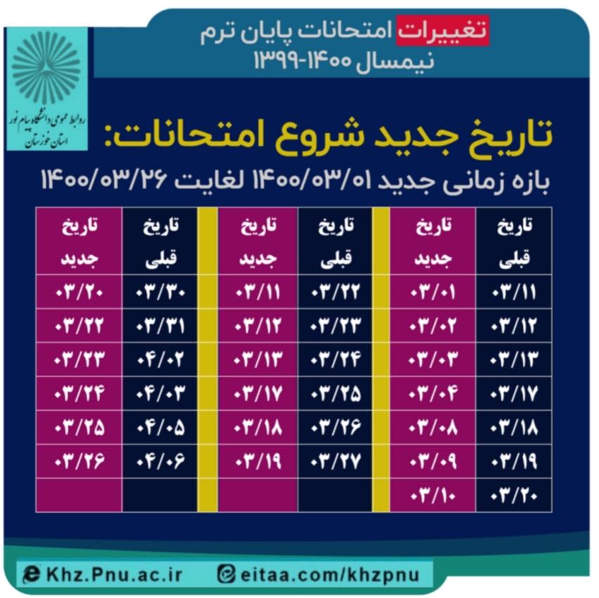 به گزارش بازتاب خوزستان ،عارف کعبی مدیر روابط عمومی دانشگاه پیام نوراستان خوزستان از تغییر تاریخ امتحانات الکترونیکی پایان ترم نیمسال ۱۴۰۰-۱۳۹۹ این دانشگاه خبر داد و گفت: آزمون های پایان نیمسال دانشگاه پیام نور بدون تغییر در ترتیب برگزاری آنها، در بازه زمانی اول تا ۲۶ خردادماه (جدول زمانی در ذیل خبر) برگزار می […]