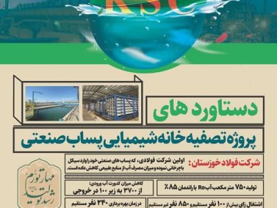 در پروژه تصفیه خانه شیمیایی پساب صنعتی شرکت فولاد خوزستان ۷۵۰ مترمکعب آب RO با راندمان ۸۵./. تولید می شود همچنین میزان کاهش کدورت آب ورودی از ۳۷۰۰ به زیر ۱۰۰ در خروجی می رسد