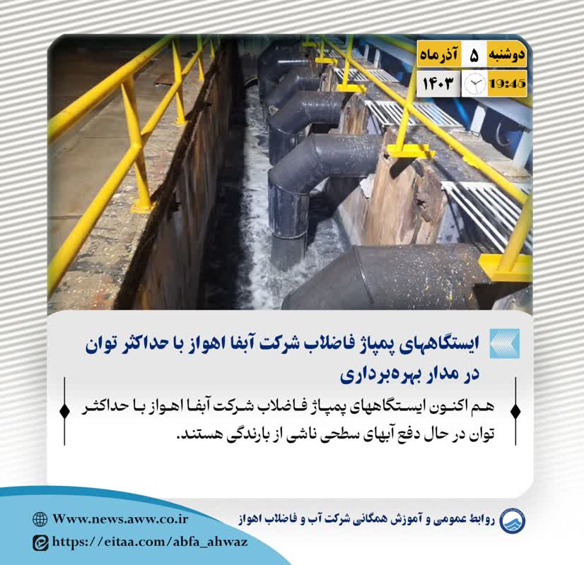 🔹 هم اکنون ایستگاههای پمپاژ فاضلاب شرکت آب و فاضلاب اهواز با حداکثر توان در حال دفع آبهای سطحی ناشی از بارندگی...