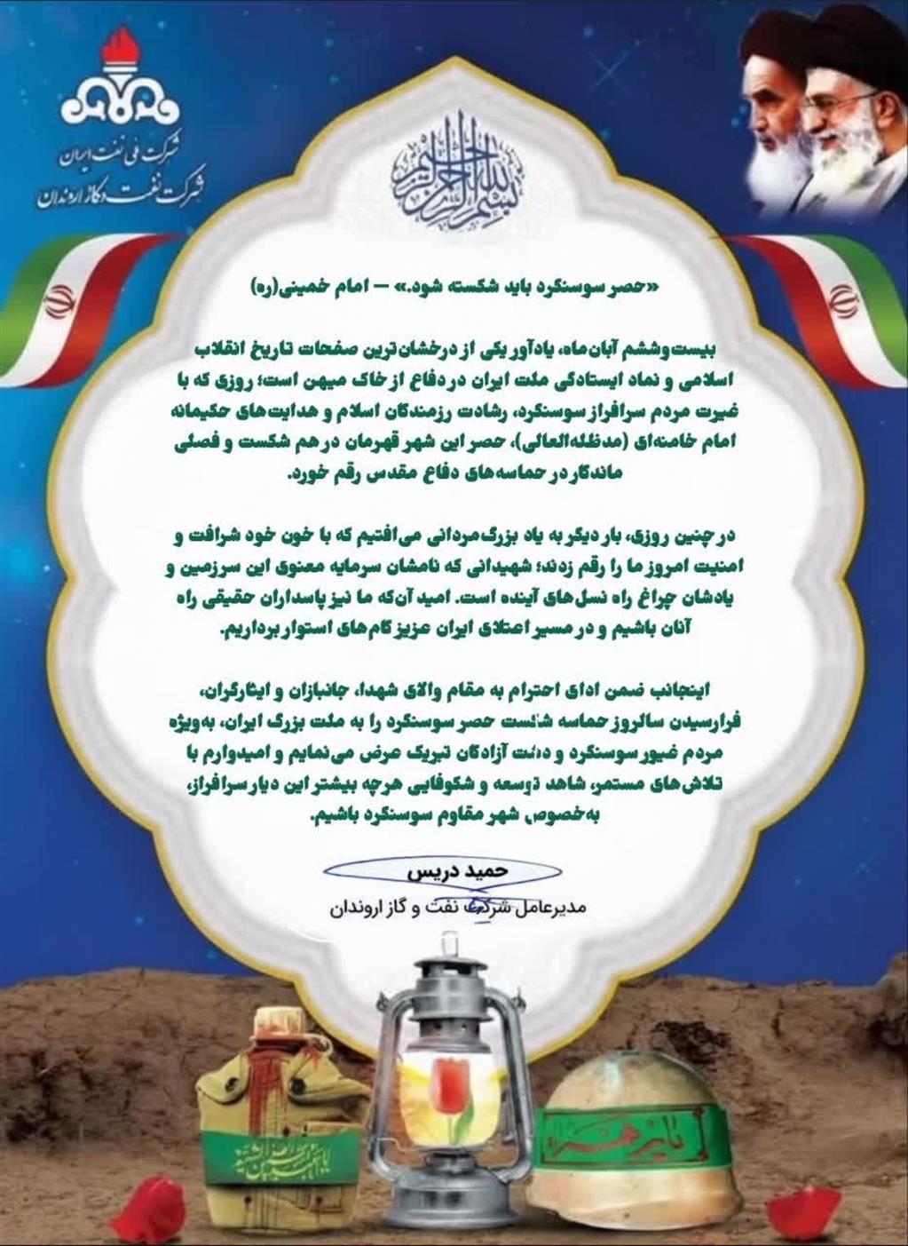 به گزارش روابط عمومی شرکت نفت و گاز اروندان، حمید دریس مدیرعامل این شرکت در پیامی سالروز شکست حصر سوسنگرد را گرامیداشت، متن پیام به شرح...